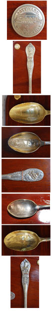 REMEMBERANCE PLAQUEComposed of four commemorative spoons (silver plate over brass): two Battleship Maine, Flagship Brooklyn & the USN Flying Squadron and the Sailor's of the City of Gloucester. Also a solid-brass, White Star Line "Steward's Badge souvenir pin. These antique items (early part of the 1900rds) have been mounted on a mahogany board for display. All items have been cleaned and sealed.