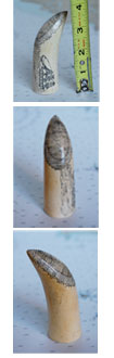 "THE WHALER" TOOTH SCRIMSHAWThis is a piece of bone (not sure what kind... maybe whale??) that has been carved to resemble a whale's tooth then handsomely scrimmed depicting a whaling ship and her dories on the hunt. If you look closely at the pointed end of the tooth you will note that another piece was cleverly laminated on to form the tooth design. The scrimshander "CP" signed and dated (1957) his work. This antique piece is very well done and exhibits extremely good detail.