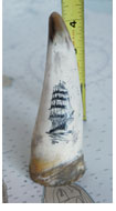WHALING SHIP HORN SCRIMSHAWThis antique, a one of a kind scrimshaw art that is scrimmed on some type of horn or antler to resemble a whale's tooth. The scene depicts a whaling ship under full sail. The scrim chandler "B" signed the piece. This original art is a good example of early sailor art.