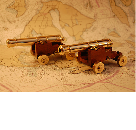 U.S.S. CONSTITUTION SHIP'S CANNON MODELSThese are hand-made reproductions of the cannons used on the USS Constitution. The barrels are solid brass and the carriages are made of mahogany. We completely disassembled this vintage pair and restored them back to near original condition… all the brass (barrels and fixtures) were polished, buffed and coated with a clear brass lacquer. The carriages were re-glued and then the wood was varnished with three coats of hand-rubbed spar varnish. A unique addition for the discriminating nautical collector.