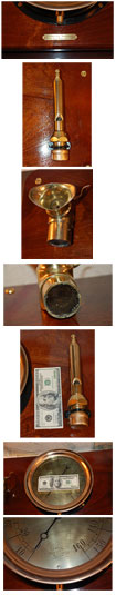SEABOARD PLAQUEThe SeaBoard was a wooden tugboat that worked Boston harbor her whole life...1921 to 1962. Her principle job was to help move ships in/out but on many occasions also performed fire fighting duty. We salvaged many artifacts from her before she was retired. This plaque contains some of the more interesting items: 1. Solid-brass voice tube. This device was used to communicate from the wheelhouse to the engine room. One blew into it, which sounded a whistle on the other end to alert the crew. 2. A Large, Crosby Gauge (10 ½” diameter)... 0 - 160 PSI (built in Boston, MA). This gauge manufacturer used this logo from 1886 and 1926. Larger gauges were used in the engine room so they could be observed from a distance. We are not sure exactly what the gauge was used for but it was for either air or water pressure). 3. "Little Toot": this was the small whistle used to communicate with a tow when she was close aboard. She serenaded Boston harbor thousands and thousands of times. All items were restored to near original condition and mounted on a solid mahogany board with four coats of hand-rubbed spar varnish. |